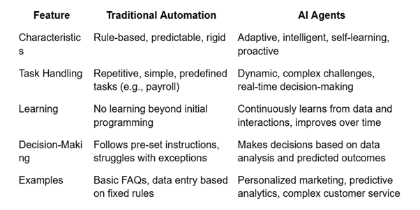 AI agents perform more than traditional workflows since they possess self-optimizing capabilities that enable independent action.