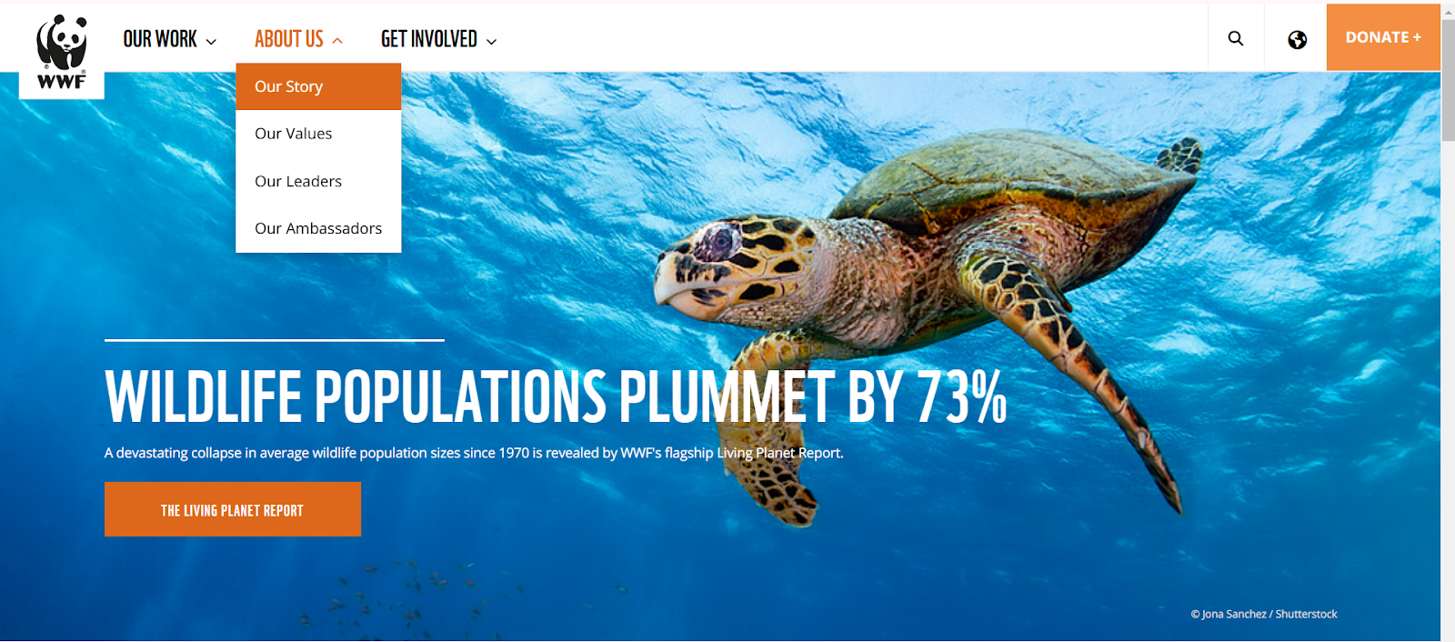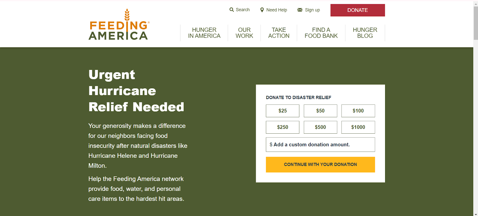 For example, don’t make them wade through multiple pages just to find your donation form. If you can, place it on your homepage. Feeding America has two “Donate” buttons, right here at the first fold of their site.