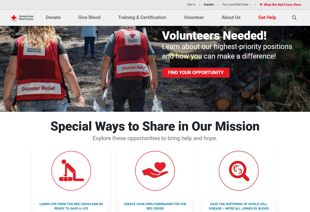 Next is your website color scheme. One example is the American Red Cross. You can see that they mainly use red and white to reinforce their branding.
