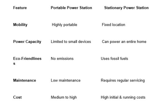 The choice between a portable and stationary power station would rest on certain grounds such as the capacity requirements, budget, and sustainability of the power source for which you may go for portable power station where you get the best option. In fact, mobility, eco-friendliness, and the quiet mode of operation for small devices will be attained by a portable power station. On the other hand, a stationary power station will be a better choice if you need a strong, continuous power supply for a whole house or large appliances and if you are ready to spend more on it but also be prepared for maintenance.