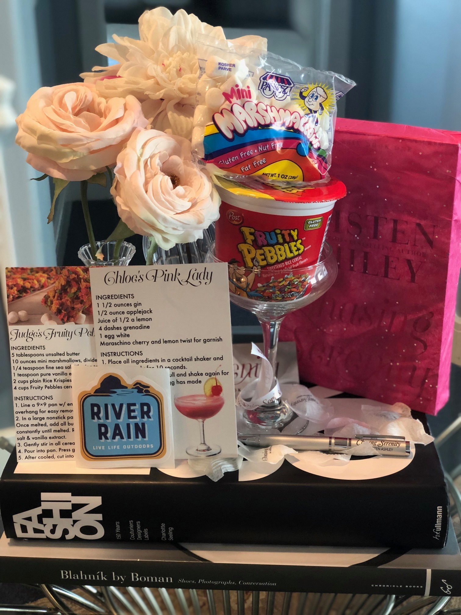Each $20 Raffle ticket buys you a chance to win the box pictured above, minus the flowers and coffee table books! This would be a signed copy of Chasing Serenity, the main ingredients for an individual portion of Fruity Pebbles Treats, a coupe glass in which to pour your pink ladies, recipe cards for both of these, a River Rain sticker, and a Chasing Serenity pen.