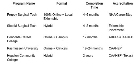 Online programs that combine accredited surgical tech training allow students to obtain certification through mixed online study and real-world clinical externships. Colleges and technical schools, along with specialized platforms, provide these certification programs to students.