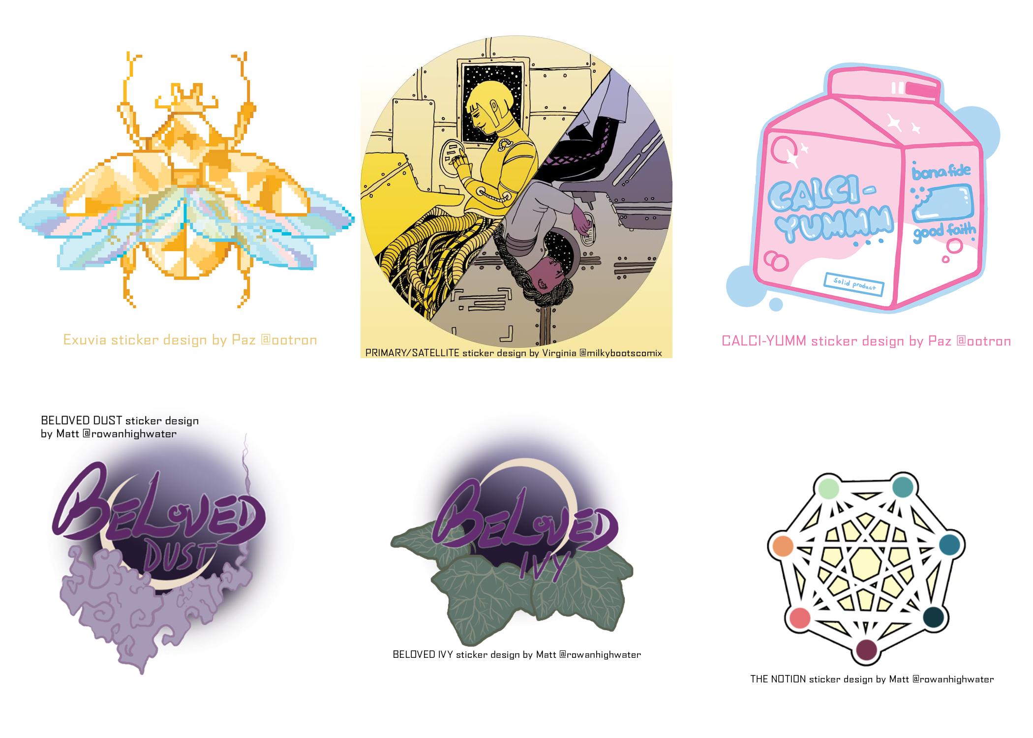 In addition, there are six bonus sticker designs that you can get as perks along with your order of the zine! They are high quality vinyl stickers, and the designs vary between 2-4 inches in size. Scroll through the images at the top of the page to see all of the sticker designs full size!