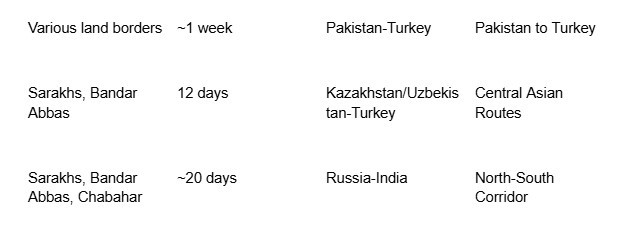 2. Pakistan to Turkey via Iran: Pakistan has also started using an overland route through Iran to reach Turkey, cutting down the travel time for goods from South Asia to Europe from up to 40 days by sea to as little as a week by road. This route enhances connectivity for South Asian markets.