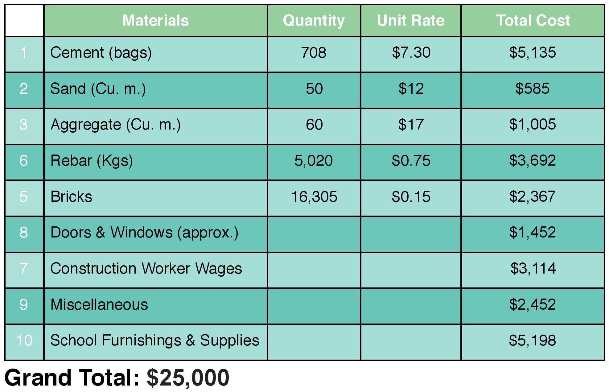 Please see below for a detailed breakdown of the costs for building a four classroom school for the wonderful and bright children of Lunis Kinderworld.